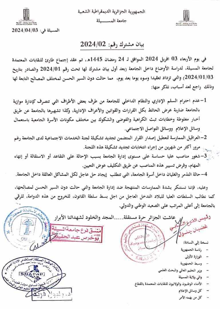 **## مطالب نقابات أساتذة وعمال جامعة المسيلة: