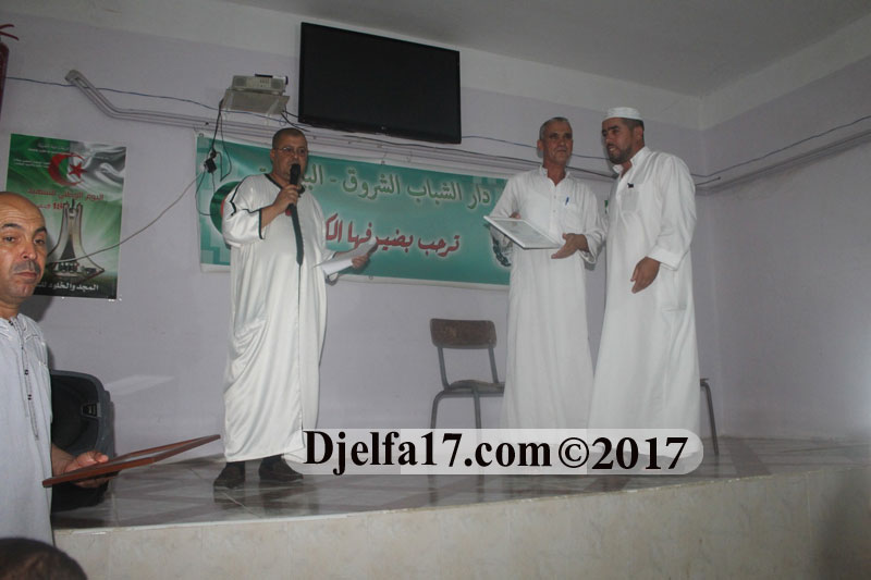 وقد اقيم هذا الحفل التكريمي يوم 20 من رمضان 1438ه الموافق ل يوم االخميس 15 جوان 2017 بعد صلاة التراويح بدار الشباب حيث تم توزيع جوائز وشهادات.