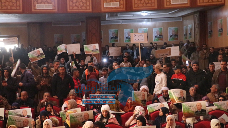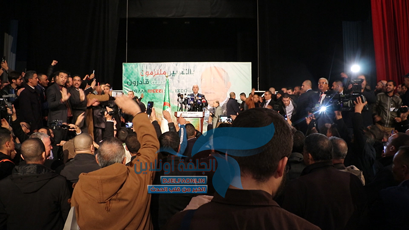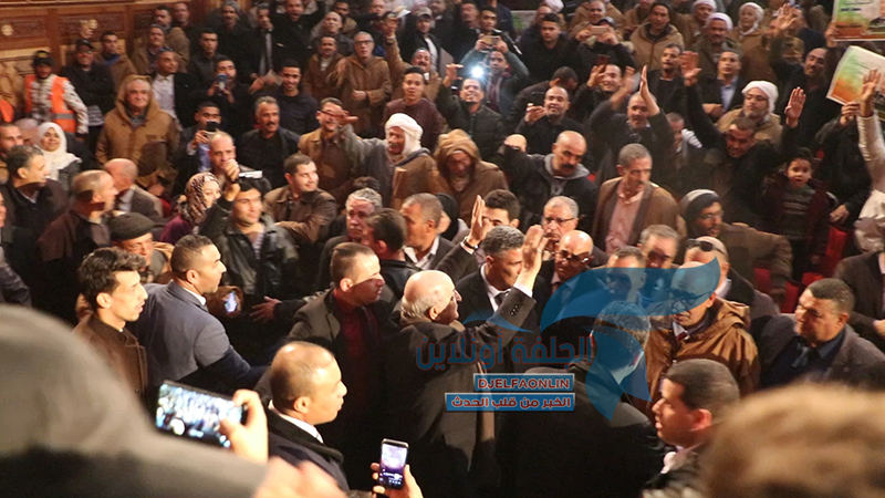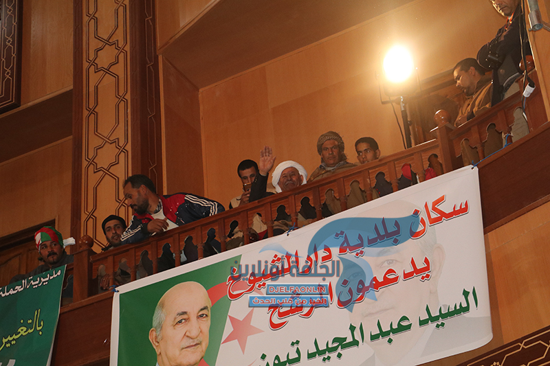 نظم المرشح الحر لرئاسيات عبدالمجيد تبون تجمعا شعبيا ضخما وذلك بقاعة العرض للمسرح الجهوي بالجلفة حيث سجل حضور قياسي وكبير لانصار المرشح السيد عبد المحيد تبون وذلك بامتلأ القاعة عن أخرها مما سبب صعوبة للمنظمين وما إن وصل المرشح حتى اهتزت كل القاعةبالشعارات والاهازبج بشكل لافت ومع بداية كلمته ثمن المرشح الحر السيد عبد المجيد تبون هذا الاستقبال الكبير وهذا الحضور الغير متوقع وقال أنه يفتخر ان بداية عمله في الإدارة بعد تخرجه كان بولاية الجلفة سنوات السبعينات وهذا ما اعتز به على حد قوله كما تناول المرشح الحر السيد عبد المجيد تبون الوضع الصعب الذي تعيشه الولاية تنمويا واجتماعيا ووعد بمعالجة كل مشاكل الولاية التي طال زمن معاناتها في عدة قطاعات و تناول المرشح وضع الشباب المستفيدين من القروض الاستثمارية المصغرة ووعد بحل كل مشاكلهم والعراقيل البيروقراطية التي حالت دون نجاح تجاربهم الاستثمارية وذلك بوضع اليات تتوافق وطموحاتهم ونمط عملهم كما كرم المرشح الحر لرئاسيات اكبر ناجحة في شهادة البكلوريا لولاية الجلفة في إشارة منه لتثمين العلم و الارادة والسير نحو الاحسن دوما وهذا من خلال ثنائه هلى هاته التجربة الناجحة واختتم التجمع بشكر كل من حضر ونظم وأيد البرنامج لتهتز كل القاعة الجيش الشعب معاك يا تبون .
